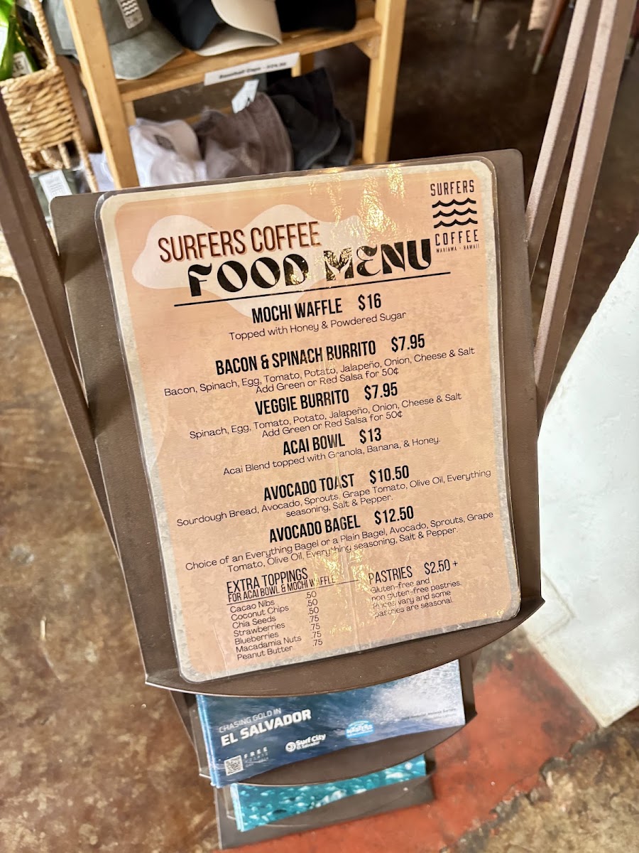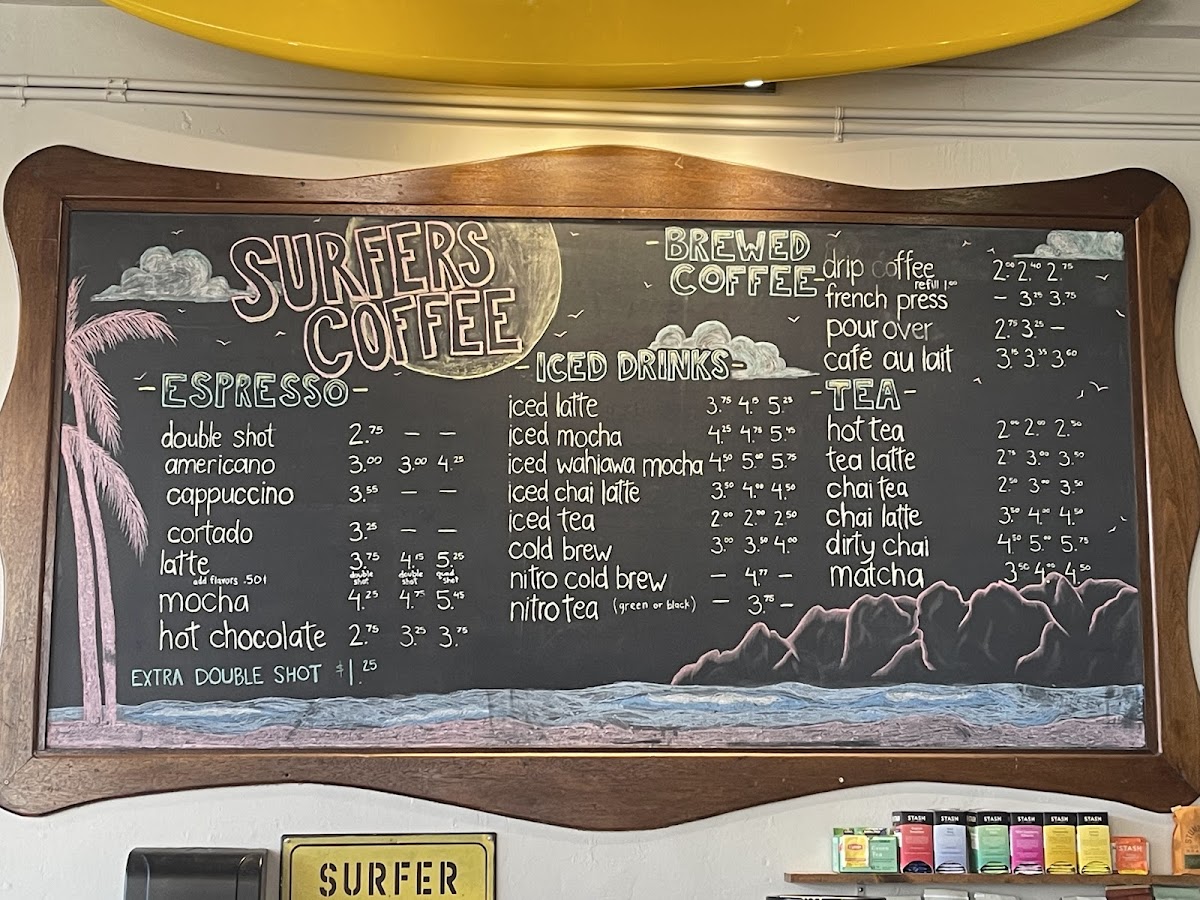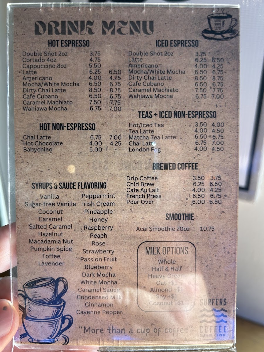 Surfers Coffee offers a thoughtfully simple menu that balances classic café favorites with island-inspired touches. Whether you’re stopping by for a morning boost or a relaxed midday break, you’ll find a comforting range of espresso drinks, brewed coffees, and light bites designed to complement the casual, welcoming atmosphere.