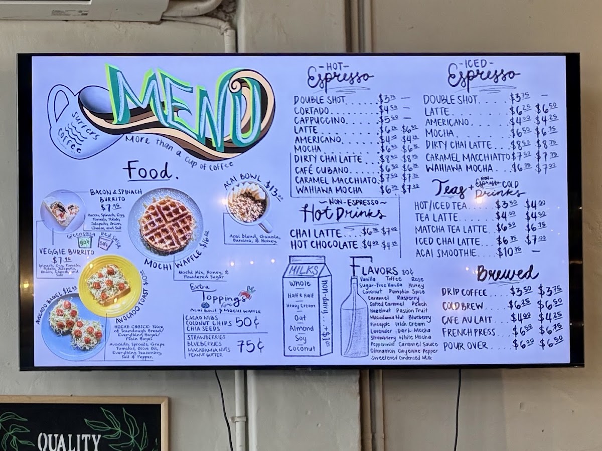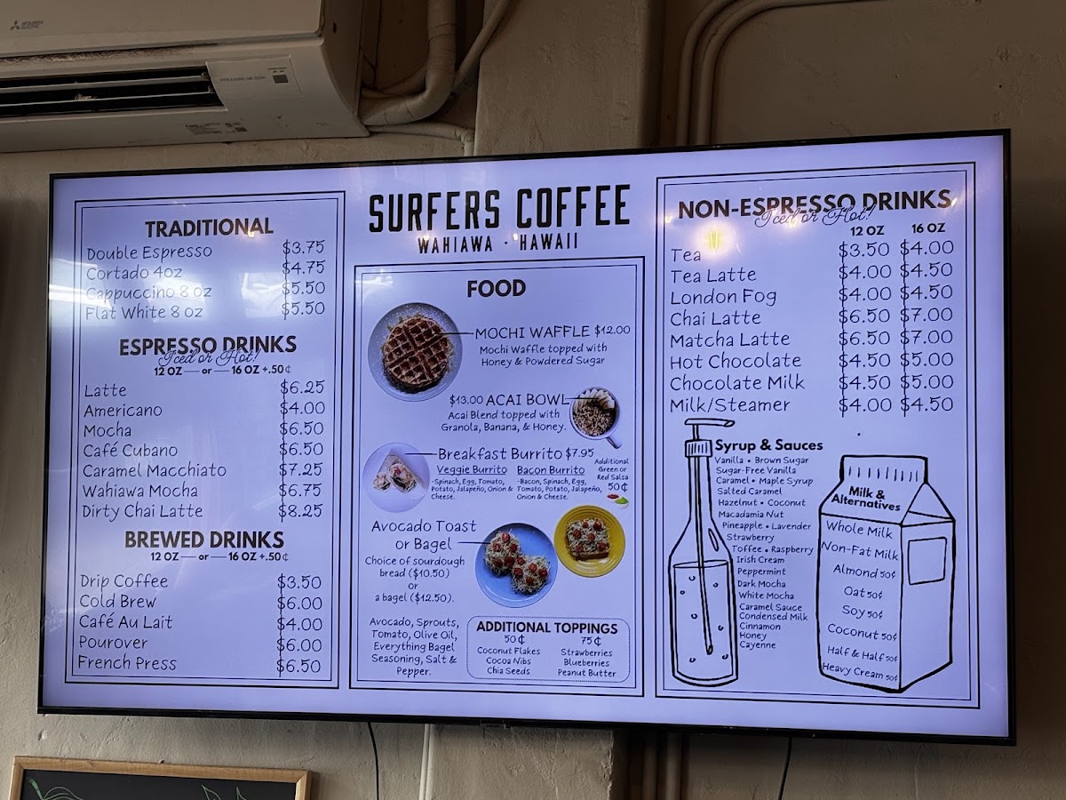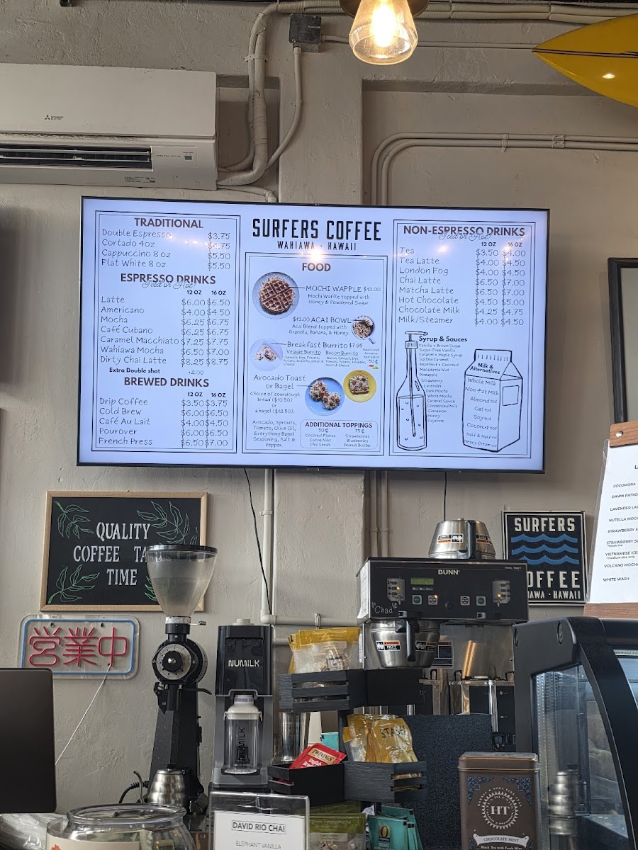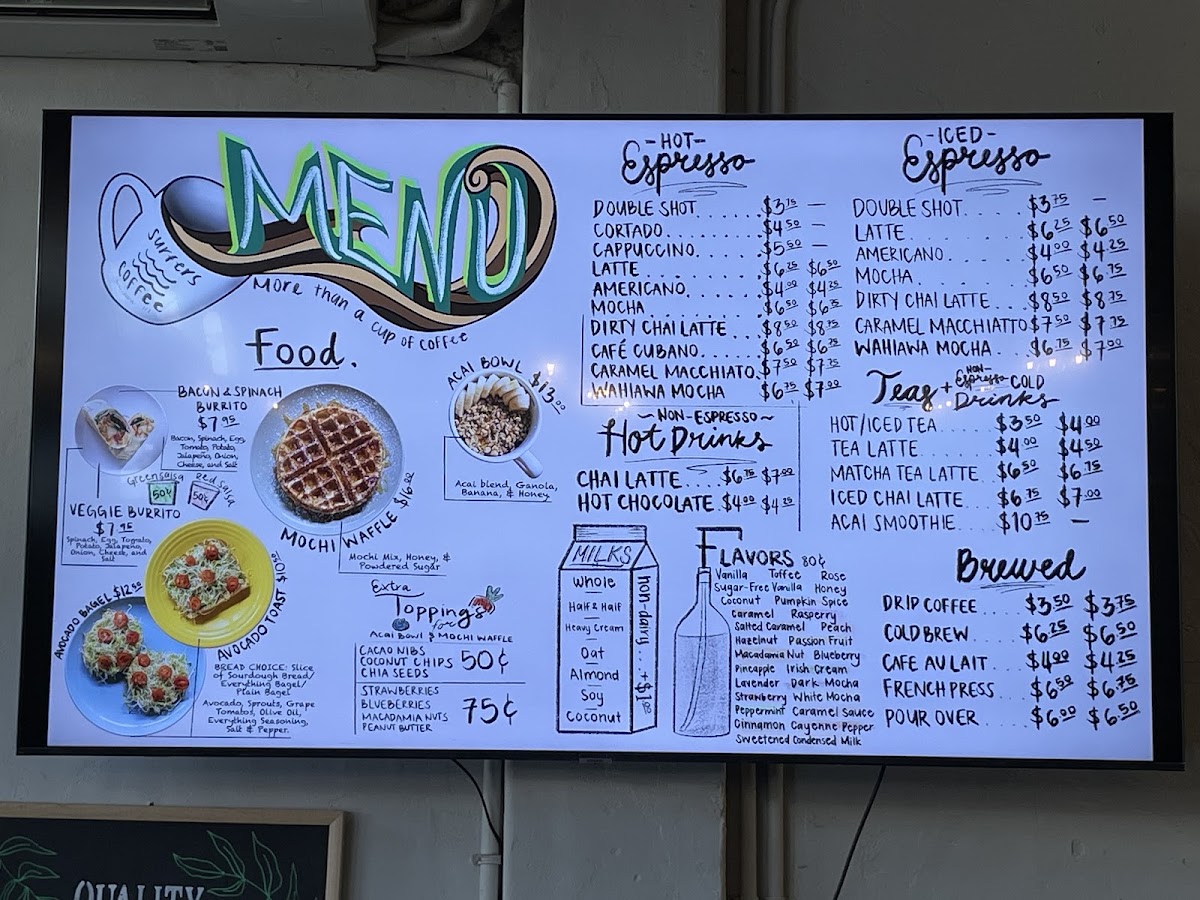 Surfers Coffee offers a thoughtfully simple menu that balances classic café favorites with island-inspired touches. Whether you’re stopping by for a morning boost or a relaxed midday break, you’ll find a comforting range of espresso drinks, brewed coffees, and light bites designed to complement the casual, welcoming atmosphere.